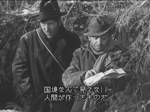 『大いなる幻影』の最後の一場面。マレシャル中尉(ジャン?ギャバン)とローゼンタール中尉(マルセル?ダリオ)がスイスへと脱出すべく国境を越えようとし、成功する。
