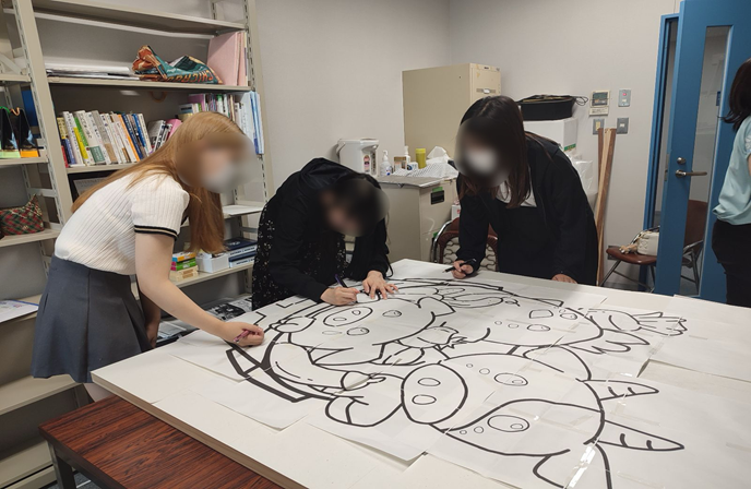 そして3年生ゼミメンバーや4年生の先輩方と合流して、まず、アクリル絵の具を使い色塗りをはじめました。